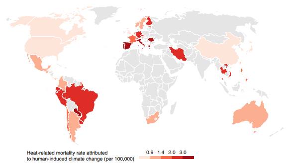 Study claims that Climate Change can explain by an average of 37.0% of heat-related mortality on 732 locations in 43 countries covered.