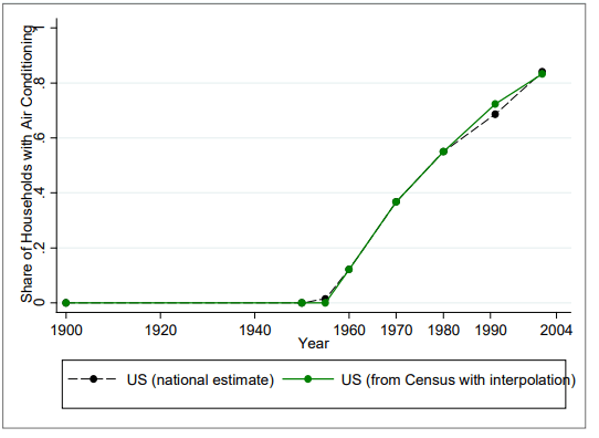 In the present-day USA air conditioning penetration is ~ 90% (of households) while in 1950 it was essentially zero. At the same time the number of days with maximum temperature above 100°F (37.8 °C) has also declined around 75% between years 1931-1959 to 1960-2004 (Source: Barreca at al 2012 table 3).